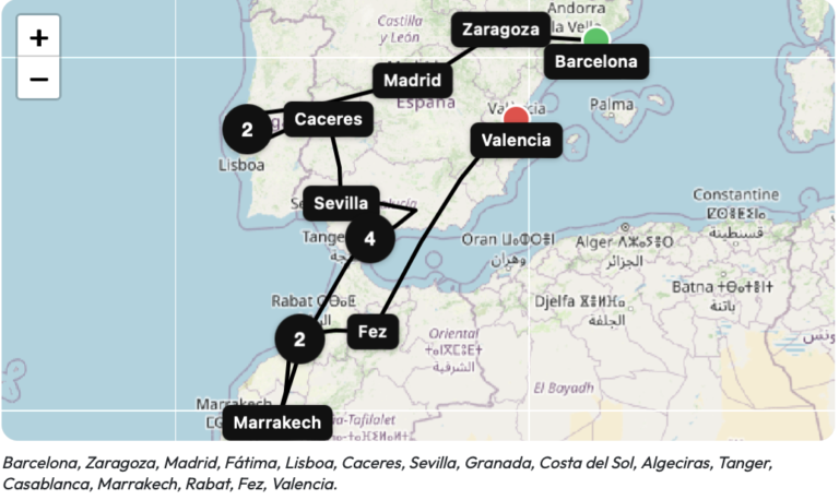 Madrid, Fátima, Lisboa, Caceres, Sevilla, Granada, Tanger, Casablanca, Marrakech, Rabat, Fez, Algeciras, Córdoba, Toledo