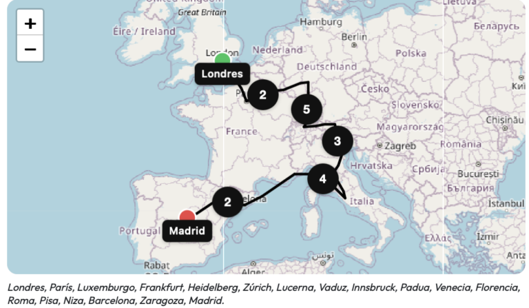 Londres, París, Luxemburgo, Frankfurt, Heidelberg, Zúrich, Lucerna, Vaduz, Innsbruck, Padua, Venecia, Florencia, Roma, Pisa, Niza, Barcelona, Zaragoza, Madrid